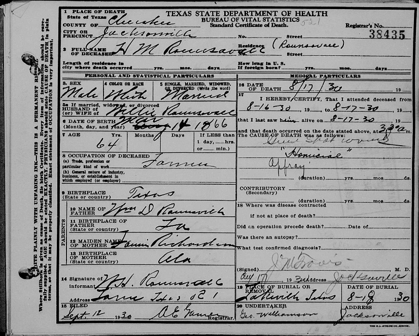 "Texas, Deaths, 1890-1976," index and images, FamilySearch (https://familysearch.org/pal:/MM9.1.1/K33P-5QQ : accessed 01 Apr 2014), H M Rounsavall, 17 Aug 1930; citing certificate number 38435, State Registrar Office, Austin; FHL microfilm 2135389.